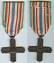 A cruz é suportada por uma fita com as cores da bandeira italiana e uma linha azul.
