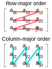 A ordem principal de coluna é usada em Fortran, MATLAB,[8] GNU Octave, S-PLUS,[9] R,[10] Julia,[11] e Scilab.[12]