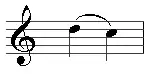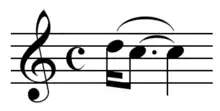 - Appoggiatura Simples Breve - A appoggiatura breve é, por muitas vezes, chamada de "acciaccatura" ou "acicatura", e sempre possui um pequeno traço a cortando. Ela retira uma mínima parte do valor da nota principal para si, geralmente no valor de uma fusa. Porém, é muito variável, pois quanto mais lento for o andamento, mais rápida será a execução. Sobretudo nos séculos XVII, XVIII e XX ela é tocada muitas vezes antes do tempo. Nesse caso a nota anterior torna-se mais curta.[1]