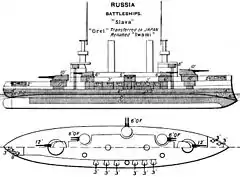 | Armamento | 4 canhões de 305 mm 12 canhões de 156 mm 20 canhões de 75 mm 20 canhões de 47 mm 4 tubos de torpedo de 381 mm |
