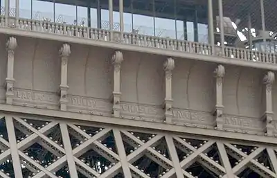 Na Torre Eiffel foram gravados setenta e dois nomes de matemáticos, físicos, engenheiros, militares e políticos franceses, em reconhecimento a suas contribuições à República Francesa, cujo centenário se comemorava então (1789-1889).[1] Estas gravações foram cobertas por tinta no começo do século XX, e restauradas em 1986-1987 pela Société Nouvelle d'exploitation de la Tour Eiffel, uma companhia contratada para negócios relacionados à Torre.