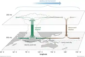 Padrões distintos de anomalias de circulação atmosférica de nível inferior e superior acompanham o padrão relacionado à MJO de chuvas tropicais aprimoradas ou diminuídas nos trópicos. Esses recursos de circulação se estendem ao redor do globo e não se limitam apenas ao hemisfério oriental. A oscilação Madden – Julian se move para o leste entre 4 m/s (14 km/h, 9 mph) e 8 m/s (29 km/h, 18 mph) através dos trópicos, atravessando os Trópicos da Terra em 30 a 60 dias, com a fase activa da MJO rastreados pelo grau de radiação de ondas longas de saída, que é medido por infravermelhos - satélites de tempo geoestacionários. Quanto menor a quantidade de radiação emitida por ondas longas, mais fortes os complexos de tempestade, ou convecção, ficam nessa região.[3]