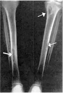 - Osteíte fibrosa cística (ou doença de Von Recklinghausen de osso ): reação ao hiperparatireoidismo avançado, em que o osso sofre lesões císticas mais comuns em metacarpos, falanges, ossos do quadril e fêmur e que podem afetar a coluna vertebral e causar compressão medular.[1]