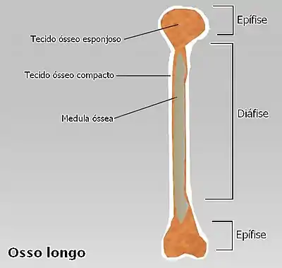 Estrutura dura e sólida, constituída de por duas substâncias: uma orgânica, a osseína, de constituição glicoproteica, e outra inorgânica, representada pelos sais minerais, de cor branco amarelada que forma arcabouço,[3] sua principal função é a sustentação, proteção aos Orgãos internos, ponto de apoio para fixação dos músculos, reserva mineral e formação das Células do sangue.[4]