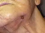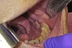 | 3 | Exposição óssea necrosada ou uma fístula que sonda o osso em pacientes com dor, infecção e um ou mais dos seguintes: exposição de tecido ósseo e necrótico estendendo-se além da região alveolar (borda inferior e ramo da mandíbula, seio maxilar e osso zigomático) resultando em fratura patológica,[nota 2] fístula extra-oral, comunicação buco-sinusal ou osteólise que se estende até o assoalho do seio maxilar | Enxaguante bucal, antibioticoterapia e controle da dor, desbridamento cirúrgico ou ressecção | ![]() |