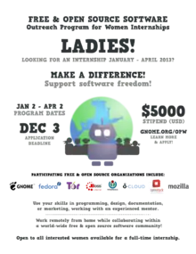 Na rodada de Janeiro de 2013, o programa foi renomeado para Free and Open Source Software Outreach Program for Women, expandido para oferecer 25 estágios com 10 organizações (Deltacloud, Fedora, GNOME, JBoss, Mozilla, Open Technology Institute, OpenITP, OpenStack, Subversion, e Wikimedia), com a diretora executiva do projeto GNOME, Karen Sandler, se juntando a Zhurakhinskaya na organização do programa.[21]