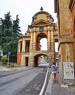 Os dois trechos do pórtico são unificados pelo Arco do Meloncello, que foi projetado por Carlos Francesco Dotti em 1714. O arco foi construído, em 1718, um projeto adaptado de Dotti, no estilo barroco, com arco rebaixado inferior servindo de passagem para veículos e pedestres pela via Saragozza; e o arco superior com quatro altas colunas jónicas, ladeada por pilastras que apoiam uma abóbada de berço, que interliga os pórticos, sendo de passagem somente para pedestres. No centro do entablamento e nos quatro cantos internos está o brasão da família Monti Bendini. [1]