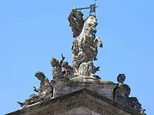 Coroa a construção uma cobertura adornada de balaustrada. Nos laterais estão colocados frontões curvos, e no meio um frontão triangular, sustentado por colunata pareada. Deste jeito se realça essa parte central, que avança ligeiramente para a praça, que chama a atenção, pois nela se situa a entrada principal. Enquanto nos frontões laterais se colocaram os seus respectivos escudos de Raxoi, no central situa-se um tímpano que desenvolve, em relevo, a batalha de Clavijo, na qual segundo a lenda interveio o mesmo Santiago Apóstolo, epônimo da cidade, em auxílio dos cristãos. Foi desenhado pelo pintor galego Gregório Ferro, e executado, em mármore, pelos escultores Xosé Gambino e Xosé Ferreiro, ambos também galegos. Este último foi ademais o autor do Santiago equestre que termina a cimeira do frontão.