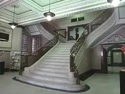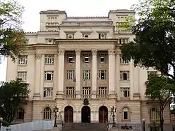 Escadarias com patamares bifurcados servem às entradas laterais. A fachada principal possui rampa para automóveis e largas escadarias, que terminam ladeadas por duas estátuas. A que está situada à direita de quem entra, representa o comércio na figura do deus romano Mercúrio, que corresponde a Hermes, na mitologia grega. Do lado esquerdo fica a deusa romana Minerva, que é a Palas Atenas da Grécia Antiga e simboliza a sabedoria, a ciência e as artes. Elas antecedem os três arcos triunfais da entrada nobre, acima dos quais se destaca o brasão nacional e se desenvolve o alpendre do segundo pavimento, com colunas colossais que alcançam o terceiro andar.