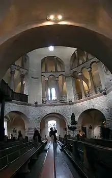 Os clérigos encarregados da capela ocupavam vários edifícios, que apresentavam uma planta em forma de cruz latina: a leste uma cúria, a norte e a sul umas oficinas ou áreas de trabalho e a oeste um ante-corpo (Westbau)[22] e um átrio com êxedras. Contudo, a peça central era a capela, coberta por uma cúpula octogonal, com um diâmetro de 16,54 metros e uma altura de 31 metros.[23][24] Oito maciços pilares suportavam as grandes arcadas. No piso térreo, uma nave colateral rodeava a nave situada sob a cúpula; ali se encontravam os servidores do palácio.[25]