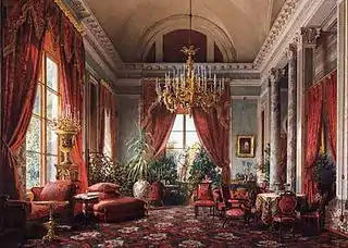 Alexandre I deu o palácio ao seu irmão, o futuro Nicolau I, para uso estival. A partir dessa época, o palácio passou a ser a residência de Verão do herdeiro ao trono. Entre 1830 e 1850, foram empreendidas extensos trabalhos de redecoração, de acordo com os desenhos de D.Cerfolio, A.Thon, D.Yefimov, A.Stakenschneider e outros, tendo em consideração as rápidas alterações de gostos. A aparência das salas formais e privadas do palácio, durante o reinado de Nicolau I podem ser vistas nas refinadas aquarelas de E.Hau, I.Premazzi e I.Volsky, entre 1840 e 1860. A famosa Galeria Montanha, a qual possuía um grande plano inclinado para os filhos de Nicolau I, construído durante o seu reinado. Nicolau I e a sua família viviam no palácio desde o início da Primavera até ao final de Maio e, depois de um curto período na cidade de Krasnoye Selo durante as manobras, regressavam ao Palácio de Alexandre para passar o tempo até ao final do Outono. Em 1842, o casal Imperial celebrou as suas Bodas de Prata com uma série de galas, incluindo um torneio de justa medieval. Dois anos mais tarde, a família ficou de luto pela morte da filha de Nicolau I, a Grã-Duquesa Alexandra (1825-1844) que nasceu no palácio e ali viveu os últimos meses da sua vida. No dia 19 de Outubro de 1860, a Imperatriz Alexandra Feodorovna também faleceu no palácio. Mais tarde, Alexandre III teve os seus aposentos na ala direita do palácio.