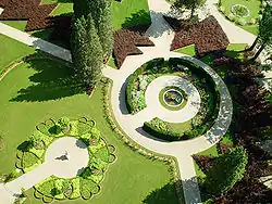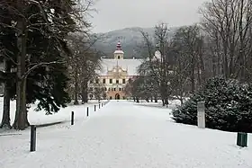 Logo no momento da construção do palácio, no século XVII, um relatório já dá conta da existência dum jardim murado a sudeste do edifício. A seguinte grande expansão do jardim ocorreu após a conclusão da casa por Johann Seyfried de Eguemberga. No último terço do século XVII o jardim foi generosamente ampliado em volta do edifício, seguindo o padrão do estritamente subdividido jardim à italiana, com parterres, áreas com bosquetes, fontes, aviários e jardins de faisões.