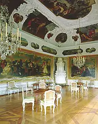 As 24 salas do segundo andar do palácio estão dispostas sob a forma dum anel. O programa das pinturas do tecto inclui cerca de 600 cenas individuais, com as quais se pretende contar a história da Humanidade e do mundo, com cenas da Mitologia Grega e Romana, cenas religiosas do Antigo Testamento e lendas históricas da Europa Ocidental. Este programa dos tectos com as suas molduras em estuque datam do primeiro de ornamentação no século XVII.