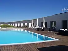 Anexo ao lado poente do palácio está o volume da pousada, desenhado de forma a acompanhar a disposição topográfica dos jardins, com três níveis de terraços divididos por duas paredes de suporte, sendo os terraços superior e intermédio correspondentes às coberturas dos quartos.[1] Estes terraços foram cobertos por áreas ajardinadas, de forma a reduzir o impacto visual dos novos volumes a partir do palácio e dos seus jardins, e que foram concebidas pelo arquitecto paisagista João Ceregeiro.[1] Este corpo é dedicado apenas às unidades de alojamento, que segundo o plano original eram sessenta e três, tendo sido igualmente construído um outro volume para o spa e a piscina exterior.[1] No palácio em si foram instaladas as áreas comuns da pousada, como as salas de estar, o restaurante e a recepção.[1] Inclui igualamente uma área para exposições, com um núcleo muselógico relativo à evolução histórica da região.[26] As antigas cozinhas do palácio foram reconvertidas num estabelecimento de restauração, o Visconde,[27] tendo sido preservados alguns elementos originais daquele espaço, como o sistema telefónico, o fogão, a chaminé e os lavatórios.[22]
