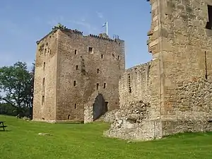 A capela e torre adjacente, são as estruturas mais antigas, datadas do final do século XIV, sendo designada Torre de David, construída em cerca de 1461-76 pelo bispo David Stewart, foi completada em 1482 e alterada em cerca de 1535-73, tendo caído em decadência em 1690.[1]
