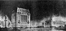O júri do concurso privado lançado no final de 1934 pelas Indústrias Reunidas Fábricas Matarazzo, para a construção de sua nova sede, em terreno de situação privilegiada junto a uma das cabeceiras do Viaduto do Chá já havia estipulado que a proposta vencedora não deveria ser “demasiado antiga”, nem se destacar “pela excentricidade de seu modernismo”. O projeto ganhador foi do Escritório Ramos de Azevedo, Severo & Villares que adotava portanto um “estylo néo-classico porém actualisado pela composição à moderna de suas linhas principaes, de verticalidade acentuada”