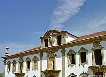 A fachada central conserva, entre duas janelas, o grande brasão, magnífica peça heráldica.