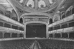 Na edificação também funcionava o Theatro Santa Helena, que ocupava os três primeiros pavimentos do bloco central e tinha capacidade para acomodar 1500 pessoas distribuídas na plateia, galeria, 36 frisas e 42 camarotes.[2] Em seu teto havia uma pintura de autoria do artista italiano Adolfo Fonzari, que ficou conhecida como “A História e a Fama do carro de Apolo”. A obra representava no céu a História e a Fama no carro de Apolo, puxado por cavalos, tendo ao alto musas e outras figuras simbólicas, cupidos e a Glória com uma coroa de louros.[5]