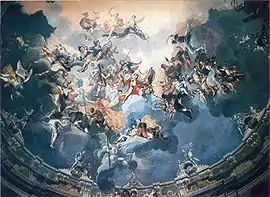 A pintura do tecto, executada por Luca Antonio Colomba, ainda ampliava mais esta sensação de espaço. Mostrava os deuses antigos, uma homenagem ao Príncipe Anselm Franz e à sua esposa, Ludovika.