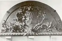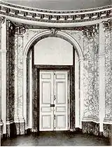 Sobre as portas encontravam-se arcos em arenito, cujas bases estavam ligadas por uma cornija intermédia que atravessava toda a parede a dois terços da altura do átrio. No tímpano foram esculpidos dois putti segurando um cartucho barroco com a coroa e o monograma do príncipe. Os putti estavam curvados para fora, ligeiramente arqueados e separados pelo cartucho. Estas decorações em estuque foram totalmente executadas por Paul Egell. O tecto branco, muito plano, assentava directamenente nas colunas através duma emblemática consola.