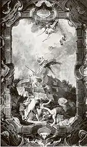O tecto da escadaria estava decorado com uma monumental pintura executada por Karl Bernardini, pintor da corte de Mannheim. Representava uma cena da Mitologia Grega, uma batalha entre deuses e gigantes:os filhos de Gaia acumulavam montanhas rudemente, de forma a alcançar o Olimpo e eliminar a linhagem divina prevalente. O deus-pai Zeus aproxima-se sobre as nuvens montado numa águia e lançando o seu raio sobre os insubordinados Gigantes, apoiado pelo archote de Hécate. Cronos, o deus do Tempo, escondia-se atrás de nuvens escuras – sendo reconhecido apenas pela sua Gadanha. Em primeiro plano, alguns gigantes continuam a lutar desesperadamente contra a sua queda, enquanto outros já se despenharam com os membros caidos.