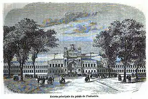 Inaugurado no dia 15 de Maio de 1855 por Luís-Napolão Bonaparte, recentemente tornado Imperador Napoleão III de França, o palácio foi o emblema da primeira Exposição Universal francesa. Essa exposição, que atingiu mais se cinco milhões de visitantes, foi a resposta do chefe de Estado francês ao sucesso da Exposição Universal londrina de 1851, elogiada, nomeadamente, pela audácia e a novidade do seu Crystal Palace.[1]