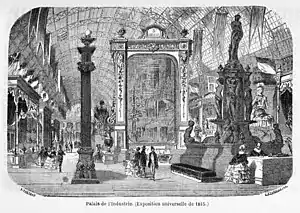 O Palais de l'Industrie dava acesso por uma rotunda, dita do "Panorama",[7] à famosa galeria anexa, chamada de "Galeria das Máquinas", uma imensa galeria de 1 200 metros de comprimento por 17 de altura, correndo ao longo do cais do Sena.
