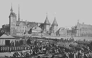 Pátio interno principal (Cour des Hommes) da Conciergerie em meados do século XIX, demolido pouco tempo depois