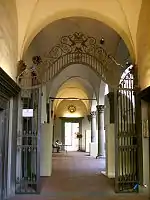O elegante pátio apresenta uma arcada em três dos lados, em pleno estilo renascentista, com arcos de volta perfeita, abóbadas de aresta e colunas em pietra serena com capitéis compósitos, esculpidos com particular perícia. Também os peducci da abóbada apresentam decorações do mesmo fabrico. Interessante é o gracioso poço, indispensável para o aprovisionamento "privado" de água aos residentes do palácio.