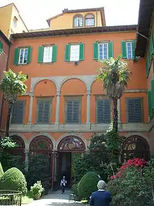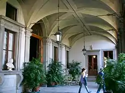 A fachada virada ao pátio mostra, no primeiro andar, três arcos, completamente tamponados, sobre semicolunas com capitéis jónicos, na cor típica da pietra serena que assenta sobre a cor rosada atual. Este loggia superior é uma reinvenção livre do motivo da serliana, presente também em outras obras de Ammannati, entre as quais a Basilica di Santo Spirito.