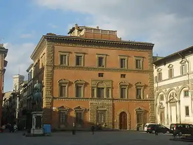 Por volta de 1573, foi provavelmente definida a estrutura do jardim à italiana e, em particular, foi realizada a fonte monumental. Em 1574, o palácio podia dizer-se terminado, embora no lado da praça não tivesse uma forma cúbica, com o segundo andar a interromper-se depois da segunda janela. Somente em 1772 Pietro Grifoni havia encomendado os trabalhos que deram ao palácio a forma atual. No mesmo período, o jardim foi aumentado e a fonte quinhentista foi deslocada e substituída com uma parede onde foi colocada a estátua de Vénus.