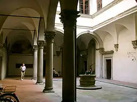 O palácio desenvolve-se em volta dum pátio central, perfeitamente conservado, com uma loggia com colunas e arcos de volta perfeita em três dos lados, enquanto o quarto lado (o de leste) apresenta volticciole. De notável valor são os capitéis e os peducci esculpidos em estilo compósito (nos peducci também se distingue o brasão dos Serristori). Nos pisos superiores desdobram-se filas ordenadas de janelas rectangulares (com arquitraves salientes no primeiro andar, mais simples no segundo) intervaladas por uma faixa decorada com óculos em pietra serena e cornijas marca-piso dentilhadas. O segundo piso também apresenta uma fila de delgadas semi-colunas abaixo do beiral, além do qual se distingue um terceiro andar mais simples.
