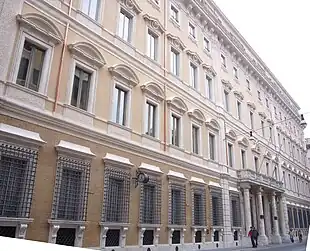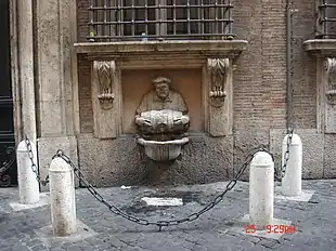 As esquinas, rusticadas no piso térreo, são formadas por lesenas com elementos curvilíneos. Numa delas ficou por muito tempo a Fonte do Facchino de Jacopo Del Conte. Alimentada pela Água Virgem e uma das seis estátuas falantes de Roma, foi levada em 1872 para a lateral direita do palácio na Via Lata, provavelmente para protegê-la do tráfego e do vandalismo[3][1].