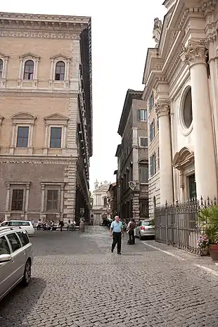 Na esquina com a Via dei Farnesi está um pequeno santuário que abriga uma "Madona e São Filipe Néri". Datada do final do século XVI e início do século XVII, o santuário é constituído por um medalhão oval circundado por dois putti e, embaixo, por uma cabeça de anjo alada. A pintura, realizada em afresco no medalhão, representa a Madona com o Menino Jesus nos braços e mostrando-o a São Filipe Néri, inclinado para beijar-lhe os pés[2].