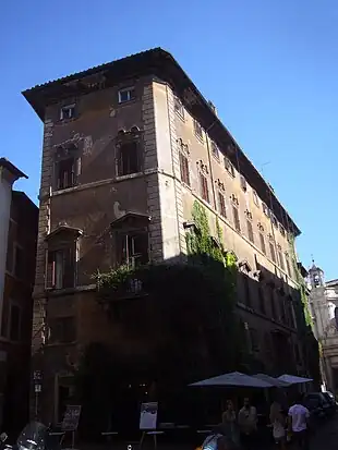 As esquinas do palácio estão decoradas por rusticações com varandas no piso nobre. Na esquina da Via della Pace com a Via dell'Arco della Pace, bem em frente à igreja de Santa Maria della Pace, a fachada é diferente e apresenta entre duas cornijas marcapiano uma primeira ordem de janelas com outras, menores, quadradas e emolduradas, logo acima; acima delas, as pequenas janelas quadradas do piso mais alto. Uma placa com uma inscrição em latim relembra a proibição papal proclamada em 1646 de qualquer alteração arquitetural na praça[3].