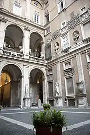Os Mattei se tornaram parentes de Fernando II de Habsburgo, imperador do Sacro Império Romano-Germânico, quando ele se casou com uma Gonzaga em 1622 e o pátio interno foi redecorado para realçar a ligação entre os antigos imperadores romanos e os imperadores germânicos modernos. Oito bustos modernos de antigos imperadores romanos foram colocados nas paredes do pátio e oito bustos de imperadores da Casa de Habsburgo na balaustrada da lógia. Oito medalhões com relevos modernos de imperadores bizantinos nas paredes do pátio estabeleceram uma ligação simbólica entre os dois grupos.[3]