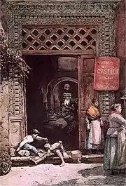 Esta é última é bem visível numa aquarela de Ettore Roesler Franz chamada "Ingresso alla Casa dei Castellani", que demonstra que esta casa nobre, no final do século XIX, abrigava um restaurante, como indica claramente a placa ("VINO DEI CASTELLI ROMANI 4 la foglietta")[2].