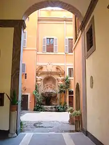 O portal dá acesso a um pátio interno ornado com uma fonte, que está inserida num nicho flanqueado por dois sátiros. O chafariz consiste em uma concha aberta, com uma das partes aderida à parede e outra atuando como uma bacia que repousa sobre rochas de tufo calcário; a água, através de alguns sulcos, escorre para um tanque de coleta de tijolos semicircular logo abaixo[1][3].
