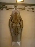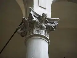 No átrio, encontra-se um brasão com dois golfinhos simétricos virados para fora atribuido a Donatello. Remonta, de facto, ao início do século XV e encontrava-se no alto do antigo Giardino dei Pazzi (Jardim dos Pazzi), na Via dell'Oriuolo, no lugar actualmente ocupado pelo Palazzo della Banca d'Italia; mais tarde, foi colocado na esquina deste palácio e só recentemente restaurado e instalado, por razões de conservação, no átrio.