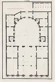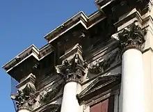Os dois tramos construídos permitem definir a solução prevista para a fachada: uma ordem colossal de semicolunas, que ocupa boa parte da altura das paredes, está inserida em altas bases e é encimada por altos capiteis compósitos que continuam a elevação dinâmica.