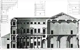 Com grande probabilidade, o palácio devia desenvolver-se em sete tramos e ter um pátio acabado em êxedra, como prova uma análise da alvenaria sobrevivente. Não é clara a razão da paragem das obras, que Vincenzo Scamozzi declara em 1615 ter levado pessoalmente à actual conclusão parcial. Os interiores foram fortemente alterados com o passar do tempo.