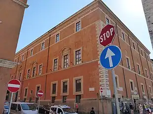O edifício, segundo uma descrição da época do papa Clemente VIII (r. 1592–1605), tinha uma fachada com nove janelas de largura, um pátio, 50 pés romanos de comprimento e 85 de largura (c. 15 x 25 metros).[2] A fachada principal tinha janelas quadradas e, no centro, um portal emoldurado por uma rusticação.[9] O motivo das "Chaves do Céu" são repetidos por toda a cornija.[9] Sobre o portal está localizada uma janela emoldurada por duas lesenas encimadas por um pedimento triangular. Acima dela está um escudo com o brasão do papa Pio XI (r. 1922–39). Originalmente havia, acima do portal, uma inscrição em latim sobre Averardo Serristori, atualmente na fachada da Via della Conciliazione.[9] Uma nova inscrição, que diz "AD CHRISTIANAM PUERORUM UTILITATE" ("Pelo benefício cristão das crianças"), originário da escola original na Piazza Pia, perto do Castel Sant'Angelo, foi colocada no seu lugar.[10]