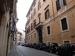 As obras de abertura do Corso Vittorio Emanuele II, realizadas em 1886, determinaram a realização de várias mudanças no edifício, sobretudo nas fachadas de frente para a Piazza Sforza Cesarini e do próprio Corso, sob a coordenação do arquiteto Pio Piacentini[2][1]. Em particular esta última, que foi notavelmente reduzida com a demolição do jardim em frente e teve a fachada de frente para a demolida Piazza Pizzo del Merlo reconstruída. A fachada na Via dei Banchi Vecchi, realizada em 1730 pelo arquiteto Pietro Passalacqua, se apresenta em três pisos com nove janelas e se abre num grande portal flanqueado por janelas gradeadas acima de outras pequenas aberturas do piso subsolo. Acima dele está uma varanda com balaustrada para a qual se abre uma janela com tímpano triangular[2].