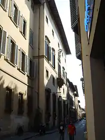 Cerca de 1490, os célebres irmãos Giuliano e Antonio da Sangallo adquiriram o terreno para construir a sua habitação, projectada por eles próprios. Giorgio Vasari explica como neste palácio os dois irmãos "conduziram em Florença, nas suas casas, uma infinidade de coisas antigas de mármores belíssimos (...)", fazendo do palácio uma espécie de museu pessoal, parecido com os dos poderosos senhores que serviram nas suas vidas; aqui figuravam estátuas antigas e modernas e pinturas de célebres artistas como Sandro Botticelli e Antonio del Pollaiolo. Apesar das enormes dimensões, as duas fachadas criam uma relação harmoniosa entre o vazio e o cheio, com uma elegante mistura entre a superfície e os elementos decorativos[2].