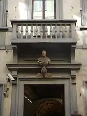 O arquitecto de Cosme I de Médici realizou um sóbrio prospecto em fachada, caracterizado por mais filas de janelas emolduradas em pietra serena, com motivos semelhantes aos dos espelhos ou das molduras dos quadros. O portal, encimado por um terraço, é um dos primeiros exemplos desta combinação em Florença e foi repetido em numeorosos palácios nos séculos seguintes. O busto de Francisco I de Médici foi esculpido por Giambologna em 1577. Realizada no final do século XVI, a fachada apresentava também uma rica decoração a fresco, como testemunha uma vista de autor anónimo e vários testemunhos, entre os quais o de Agostino Lapini, o qual registou no seu Diario de 1596 como estavam ali representados quatro retratos de homens ilustres, entre os quais Cosme I de Médici. Deste período restam, talvez, as decorações grotescas na abóbada da entrada, num estilo aproximado ao de Bernardino Poccetti.