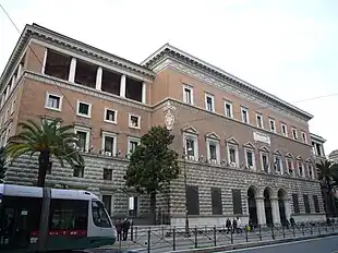 A construção do edifício, com base num projeto de 1913 do arquiteto Pio Piacentini, levou à demolição de uma série de residências renascentistas à esquerda da Via della Seggiola, das quais se salvou apenas as Case di San Paolo, atualmente no fundo do palácio na Via di San Paolo alla Regola[1]. O edifício, a última grande obra de Piacentini, que foi diretor da Accademia di San Luca, em Roma[2], é bastante diferente do Palazzo delle Esposizioni, uma de suas obras anteriores; uma comparação entre as duas mostra uma tendência para um projeto mais conservador[3].