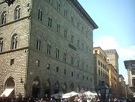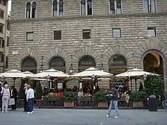 O edifício, em formas típicas do primeiro Renascimento florentino, repercute com pouca originalidade as formas dos palácios das grandes famílias florentinas, em particular as dos Palazzo Medici Riccardi, Palazzo Strozzi e Palazzo Gondi, renunciando, todavia, aos típicos zoccoli dispostos em assento contínuo, para abrir, pelo contrário, uma série contínua de arcos nos quais estão instalados grandes estabelecimentos comerciais, entre os quais o célebre bar Rivoire. Para aumentar a disponibilidade de espaço útil, apresenta quatro andares no lugar dos três tradicionais. Outro significativo desvio dos modelos inspiradores é o facto de ser realizado em pietra serena em vez de na tradicional pietraforte.