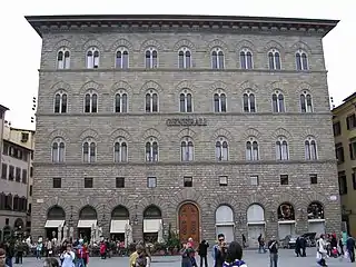 No edfício florentino, a perfeita simetria do edifício e a sua massa tornam-no imediatamente evidente, apesar da tentativa de harmonizar-se com os edifícios circundantes bem mais antigos.