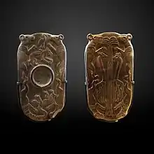 Segundo Ian Shaw, em Nacada I, elas provavelmente obtiveram conotações ritualísticas e mágicas. Em Nacada II (3500–3200 a.C.), peixes e pássaros eram as formas preferidas, e muitos tinham formas de escudo, com cabeças de pássaros no topo. Em Nacada III (3200–3000 a.C.), a gama de formas diminuiu consideravelmente, mas simultaneamente tornar-se-iam mais cerimoniais. Geralmente ovais ou em forma de escudo, foram usadas como itens votivos em templos em vez de bens mortuários e várias foram encontradas como provisões no templo da Época Tinita (3100–2686 a.C.) em Hieracômpolis. Foram gravadas com relevos descrevendo a ideologia e rituais da elite emergente.[1]
