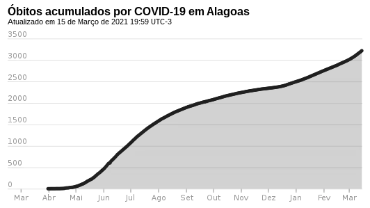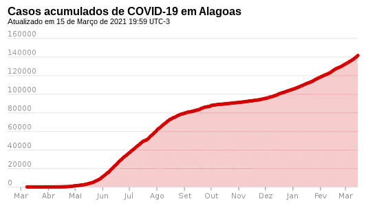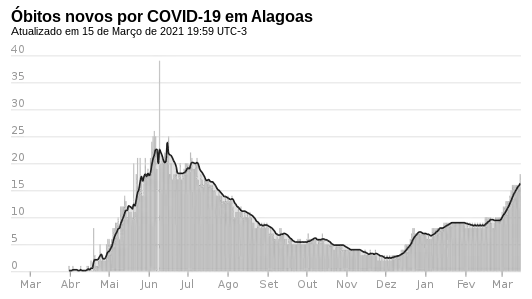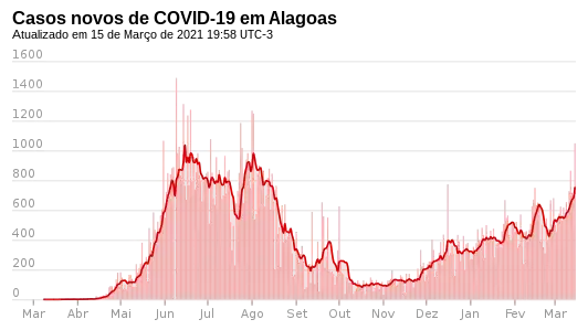 | Casos de COVID-19 em Alagoas () Mortes Recuperados Casos ativos 2020202020212021 mar.mar.abr.abr.mai.mai.jun.jun.jul.jul.ago.ago.set.set.out.out.nov.nov.dez.dez. jan.jan.fev.fev.mar.mar.abr.abr.mai.mai.jun.jun.jul.jul. Últimos 15 diasÚltimos 15 dias | ||||